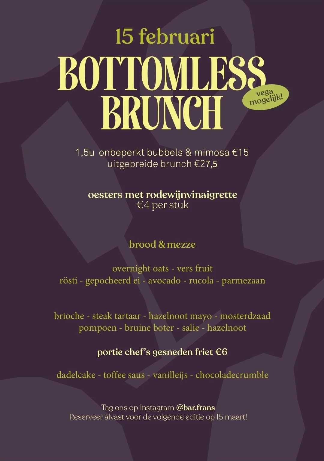 Bottomless Brunch 3 gangen shared brunch & onbeperkt mimosa’s of cava & live DJ i Menu voor 15 februari is bekend, reserveer nu snel je tafel!3 gangen shared brunch €27,50onbeperkt mimosa/cava €15vegetarisch mogelijk, vegan op aanvraag iedere 3e zondag van de maandlive DJ van 11.00u-einde